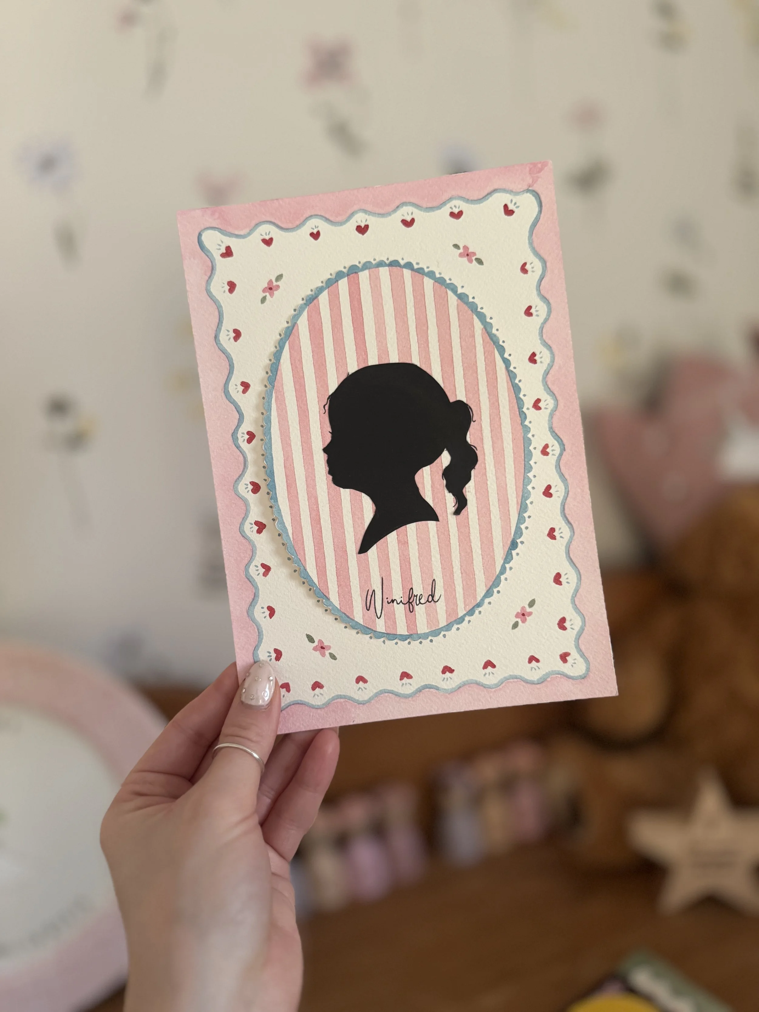 A delicate, handcrafted silhouette portrait perfect for nurseries, chidlren’s room or for gifting.